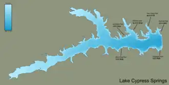 Lake Cypress Springs is a 3,461-acre (1,401 ha) reservoir in northeast Texas, approximately 90 miles (140 km) east of Dallas, Texas. The lake is used for recreational, municipal, and industrial purposes. The lake is regularly monitored by a lake patrol, which enforces wake zones, fishing licenses, boat dock rules, and boating. Lake Cypress Springs has 20 subdivisions and around 850 waterfront homes.[3] In 2011, Lake Cypress Springs was rated one of "The 10 Best Lakes to Call Home" according to D Magazine.[4]