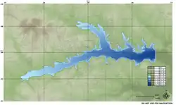 Authorization was given on 10 November 1966 to construct the dam, originally designed to impound 72,800 acre⋅ft (89,800,000 m3) of water. The dam was built by the Vibig Construction Company of Dallas, Texas, with construction starting on 1 July 1968. Construction was finished on the dam on 15 February 1971. The dam is 5,230 ft (1,590 m) long, with the top of the dam at 395 ft (120 m) above sea level.[5] Water leaves the reservoir through a morning-glory-type spillway, at a height of 378 ft (115 m), with a 6-foot (1.8 m) fish screen, which is required by the Texas Parks and Wildlife Department.[6] An emergency spillway exists at the north end of the dam to assist during major floods. The dam cost US$1,340,126 in 1969 (equivalent to $11,490,790 in 2024).[7]