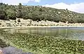 The lake is semi-circular in shape, with a diameter of 300 meters, situated at an altitude of 1520 meters and with a depth of 6 meters. With an area of 3.5 hectares it is the smallest natural lake in the Middle Atlas, and is characterized by a sub-humid climate.[3][4] Located within the Takeltont Forest Reserve, Lake Iffer is surrounded by diverse vegetation consisting mainly of evergreen oak, Aleppo pine and juniper. The lake is home to many waterfowl and has been designated a wetland by the World Wide Fund for Nature (WWF). Several fish species including crucian carp inhabit the lake, while water lilies flourish in its waters.[5]