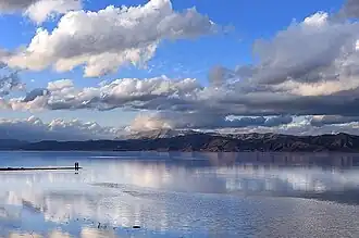 Maharloo Lake (Persian: دریاچه مهارلو) is a seasonal and endorheic hypersaline wetland in the highlands of Iran, 27.0 km (16.8 miles) southeast of the city of Shiraz in Fars province. It is surrounded lengthwise by up to 2,000 m high mountains. The lakeshore has an altitude of 1460 m and spans approximately 600 square kilometers, though its size can vary significantly depending on the season. The lake salt is rich in potassium and other salts.[1]