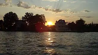 There are several islands in Lake Orion, some of which feature seasonal and year-round residences. The largest islands, Bellevue and Park, are connected to the mainland by two-lane bridges and are populated year-round. Most boats can pass under the Bellevue Bridge, which has a clearance of 9.6 feet.[27] The Park Island bridge has a lower clearance that allows only canoes, kayaks and rowboats to pass underneath. The remaining islands are reachable only by watercraft. Victoria Island is the third largest island, and is home to several seasonal and year-round homes. A smaller island, Paint Island, was home to a single residence from the 1850s to the 1950s. Little remains of the island due to erosion save for a solitary tree, and the shallow waters can be a hazard to boaters. Sweet's Island is home to the Lake Orion Boat Club, and features a private boathouse and docks for LOBC members. Romance Island is home to a single cottage, Preston Island to two seasonal cottages, Dot Island to one seasonal cottage and Armada Island to four seasonal cottages. The residences on all islands except for Bellevue and Park require the use of watercraft to travel to and from the mainland.