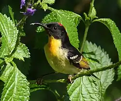 Among land birds, bird species disappeared from Lakeba in prehistoric times, probably after the upland forests were largely cleared away; introduced rats as well as hunting probably also contributed to their demise. Others managed to adapt to the alteration of habitat by humans, though they are generally not as common as on Aiwa where there has been no significant deforestation. For the most part, the avifauna of Lakeba is more similar to that of Samoa and Tonga than to that of the main group of Fiji. Quite commonly seen are the white-rumped swiftlet (Collocalia spodiopygia), Polynesian starling, (Aplonis tabuensis, either the West Fijian subspecies vitiensis or the subspecies tabuensis from the southern Lau group and Tonga), Vanikoro flycatcher (Myiagra vanikorensis), and the slaty monarch (Mayrornis lessoni) which is endemic to Fiji. Two honeyeaters, the endemic orange-breasted myzomela (Myzomela jugularis) and the widespread eastern wattled honeyeater (Foulehaio carunculatus carunculatus), have adapted well to human settlement and are rather common in the coconut plantations. The collared lory (Phigys solitarius), endemic to Fiji in modern times, also frequents this habitat, but is a rather rare species on Lakeba.[2]