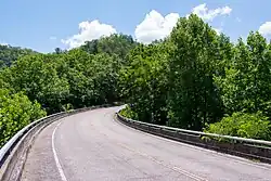 Lakeview Drive East, located near Bryson City, is a 5.8-mile (9.3 km) road from Fontana Road (SR 1364) to a parking area, located less than a 1,000 feet (300 m) from the road tunnel. The road, over 5,000 feet (1,500 m) above the Tuckasegee River section of Fontana Lake, curves along Mine Mountain and Buzzardroost Mountain before crossing over Noland Creek and then ending at the edge of Tunnel Ridge. Stone facades on bridges and wooden rails along it shoulders appears similar to the Blue Ridge Parkway. The speed limit along the road is 45-mile-per-hour (72 km/h).
