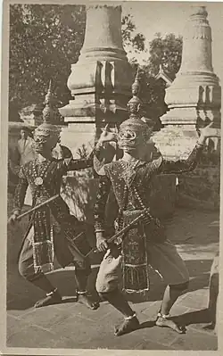 Lakhon Khol is a traditional theatre performance of Cambodia. Mask theatre of Cambodia having its origins during the Angkor period. It is believed to have begun during the 10th century through the inscription K.99 Sambor Prei Kuk temple in the reign of King Jayavarman V (CE 968-1001).[2] Lakhon Khol is believed to be a derivative of the Drama, acronym in the High Priest's Dictionary Chuon Nath. That short forms can be interpreted as a form of drama, played out in a series of short stories. The word Khol Is encountered in a number of other rocks, such as K.566-a a rock above the Stung Sreng Siem Reap province inscribed at the end of the 10th century Which refers to wearing a mask dance. The theatrical drama was developed from the Khmer shadow theatre called "Lakhon Sbeak Thom; Khmer: ល្ខោនស្បែកធំ”.[3] Lakhon Khol was recorded by Henri Mouhot at a restaurant dinner with a dance performance in the Royal Palace in the city Oudong with King Ang Duong in 1856.[4] [5] Until the Royal King Sisowath, the royal dance in the form of dance was frequently performed for French diplomats or anthropologists to be entertained by the love of Khmer classical dance.George Groslier compiled the diary "Danseuses Cambodgiennes, Anciennes & Modernes" 1913.[6] Royal dance in the form of Lakhon Khol means that the king royal dance is a form of dance masks. The evolution of Cambodian dance art is linked to nature, social class, and Brahmin religion, the original religion of the country India, Hindu religion, which is related to the story incorporated into the art of Cambodian dance, the liveliness of Cambodian dances are recorded by George Coedes (La dance du Cambodge) in 1944.[7]