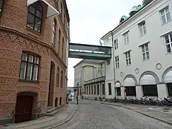 The building with the rounded corner at Laksegade 4/Vingårdstræde 3 is from 1927 to 1928 and was designed by Carl Brummer. A skyway connects it to a numberless, gabled building on the other side of the street.