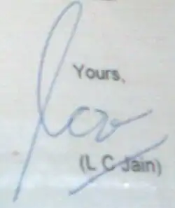 Lakshmi Chand Jain (1925–2010) was a political activist[1] and writer. Later, he served at various times as a member of the Planning Commission, as Indian High commissioner to South Africa, as a member of the World Commission on Dams (WCD) and as secretary of the Indian Cooperative Union and the All India Handicrafts Board (AIHB). His position as the ambassador was terminated as the Vajpayee Government felt that he had not defended India's position on Nuclear tests effectively in South Africa. He eventually joined the Indian National Congress. He was posthumously awarded Padma Vibhushan, the second highest civilian award, by the UPA government. However his family declined to accept the award, saying that Jain was against accepting State Honours.[2]