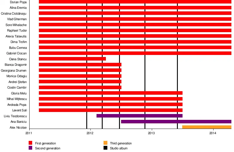 The group went successful in 2011, 2012 and 2013. The group disbanded shortly after O nouă viață ended. At the time of the disbandment, it only consisted of 12 members, who are Dorian Popa, Alina Eremia, Cristina Ciobănașu, Vlad Gherman, Sore Mihalache, Raphael Tudor, Alexia Talavutis, Dima Trofim, Bubu Cernea, Gabriel Ciocan, Ana Banciu and Alex Nicolae.