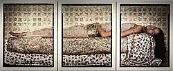 The women depicted in her exhibition of photographs, Les Femmes du Maroc, are represented as decorative and confined by the art of henna.[9] Essaydi thus poses her subjects in a way that exemplifies society's views of women as primarily destined for mere beauty. Henna, however, is extremely symbolic, especially to Moroccan women. It is an association with familial celebrations of a young girl reaching puberty and transitioning into a mature woman. The use of henna in her work creates a silent atmosphere of the women "speaking" to each other through a quality of femininity. It is predominantly a painting process where women who are discouraged to work outside the home find a profitable work in applying a tattoo-like material.[9] Beyond creating powerful pieces revolving around the art of henna, Essaydi includes interpretations of traditional Moroccan elements, including draped folds of cloths adorning women's bodies, mosaic, tiles, and Islamic architecture.[10]