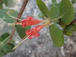 Lambertia orbifolia, commonly known as the roundleaf honeysuckle,[2] is a shrub or small tree that is endemic to the south-west of Western Australia. It has more or less circular leaves and groups of between four and six orange-red flowers.