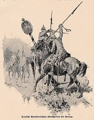 In 1914, lances were still being carried by regiments in the British, Indian, French, Prussian, Italian,[4] Chilean, Portuguese, Japanese, Spanish, Ottoman, Belgian, Argentine, Russian, and Siamese armies, among others. Almost all German cavalry branches (cuirassiers, hussars, dragoons, and uhlans) retained steel tube lances (stahlrohrlanze) 3.2 meters (10 ft) in length, as their primary weapon.[5] As late as 1914, half of the troopers in each Russian regular cavalry regiment (hussars, uhlans, and dragoons) carried lances on active service, as did all cossacks.[6]