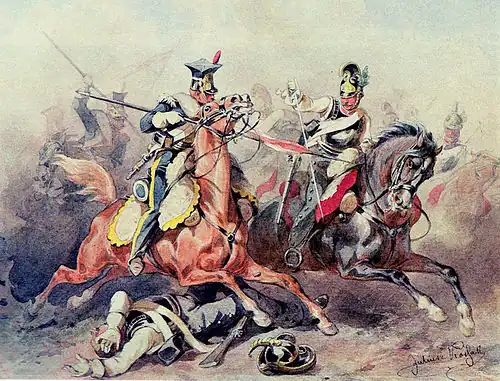 Although having substantial impact in the charge, lancers could be more vulnerable to other cavalry units in close quarters combat, where the lance proved to be a clumsy and easily deflected weapon when employed against sabres in a mêlée.[3] By the late 19th century, many cavalry regiments in Eurasian armies were composed of troopers with lances in the front rank and those with sabres in the second: the lances for the initial shock and sabres for the ensuing mêlée.