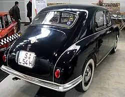The Appia Berlina (saloon/sedan) was introduced in April 1953 at the Turin Motor Show.[3] The chassis code is C10 for the right hand drive saloon—the standard version, as was customary at Lancia—and C10S (from Sinistra, Italian for "left") for the left hand drive variant, available on request. Under the Appia's bonnet there is a 38 PS 1.1-litre engine, which according to the manufacturer could push the car to 120 km/h (75 mph).[3] The body style is similar to the Lancia Aurelia. To save weight the doors and rear fenders of the first few thousand examples were aluminium.[3] The bumpers were also aluminium, making them easily dented. Rubber stripping was added later, to protect them from minor impacts.[3] In a design inaugurated by the 1933 Lancia Augusta, rear doors were aft-hinged suicide doors, eliminating the B-pillar. A spare tyre, the fuel filler and the battery were located in the trunk/boot. The interior featured bucket front seats, a column-mounted shifter, ivory plastic steering wheel and switches, and panno Lancia wool cloth upholstery in grey or beige. Running on 155HR15 Pirelli Cinturato tyres. In total 20,025 first series saloons were made, from 1953 to 1956.[3] Of these, the majority—10,257—were right hand drive, and the remaining 9,768 left hand drive.[4]