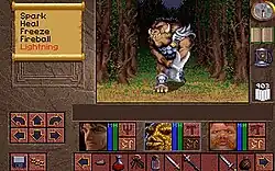 The player can play as one of four characters,[5] each of which have their own statistics and specialize in certain areas.[6] The characters' main statistics are might and protection, which affect the damage dealt and absorbed, respectively.[7] The player can equip characters with items such as weapons and armor, which affect these statistics.[8] Some weapons have special properties, such as having a chance to deal extra damage or kill enemies straight away.[9] Not all special properties are favorable: for example, there is a bow that never hits anything.[10] Other items that can be collected and placed in an inventory include medicine, keys, and rings that grant the wearer benefits such as increased health regeneration.[11] Characters also have Fighter, Rogue, and Mage skills.[12] Fighter affects the character's ability to engage in combat, Rogue affects their ability to use bows and pick locks, and Mage affects their ability to cast spells.[12] Spells include fireballs, lightning, and healing characters, each having four power levels.[13] Performing these actions increases the character's ability to do so.[7] Characters join and leave the party throughout the game.[4]