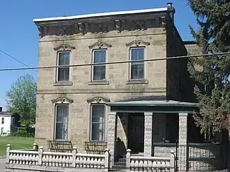 Lang-Hess House is a historic home located at Wheeling, Ohio County, West Virginia. It was built about 1865, and is a two-story sandstone building with Italianate design details. An attached ‘sun porch’ was added to the house about 1935. Its builder was associated with the architect and engineers of the Wheeling Suspension Bridge, and is believed to have used “extra” sandstone to build his residence following the work on bridge.[2]