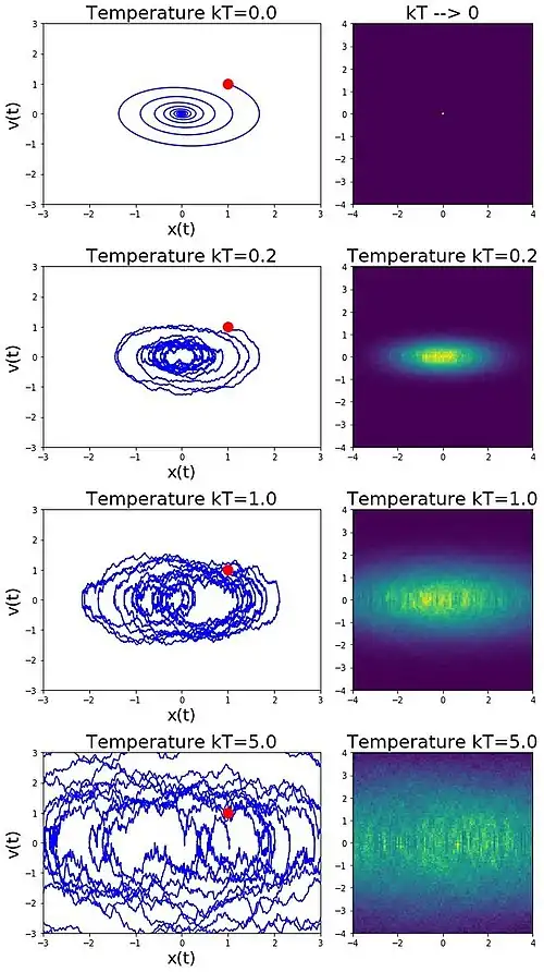 A particle in a fluid is described by a Langevin equation with a potential energy function, a damping force, and thermal fluctuations given by the fluctuation dissipation theorem. If the potential is quadratic then the constant energy curves are ellipses, as shown in the figure. If there is dissipation but no thermal noise, a particle continually loses energy to the environment, and its time-dependent phase portrait (velocity vs position) corresponds to an inward spiral toward 0 velocity. By contrast, thermal fluctuations continually add energy to the particle and prevent it from reaching exactly 0 velocity. Rather, the initial ensemble of stochastic oscillators approaches a steady state in which the velocity and position are distributed according to the Maxwell–Boltzmann distribution. In the plot below (figure 2), the long time velocity distribution (blue) and position distributions (orange) in a harmonic potential () is plotted with the Boltzmann probabilities for velocity (green) and position (red). In particular, the late time behavior depicts thermal equilibrium.