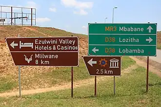 ![]() Road signs in English in Eswatini, with Swazi placenames | |