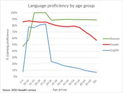 Kazakhstan is officially a bilingual country. Kazakh (part of the Kipchak sub-branch of the Turkic languages) is proficiently spoken by 80.1% of the population according to 2021 census, and has the status of "state language". Russian, on the other hand, is spoken by 83.7% as of 2021.[1] It has a status of "official language", rather than the "state language" Kazakh, and is used routinely in business, government, and inter-ethnic communication. However, only 63.45% of ethnic Kazakhs and 49.3% of the country's population are daily speakers of Kazakh language, according to the same census.[2]