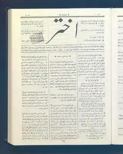 Several provincial newspapers (Ottoman Turkish: vilayet gazeteleri) were written in Arabic.[27] The first Arabic language newspaper published in the Arab area of the empire was Ḥadīqat al-Akhbār, which Strauss has described as having a "semi-official" status.[29] There was a French edition with the title Hadikat-el-Akhbar. Journal de Syrie et Liban.[30] Others include the Tunis-based Al-Rāʾid at-Tūnisī and the bilingual Ottoman Turkish-Arabic paper in Iraq, Zevra/al-Zawrāʾ. According to Strauss, the latter had "the highest prestige, at least for a while" of the provincial Arabic newspapers.[31]
