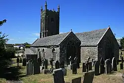 The church is dedicated to St Marnarck (although it was originally dedicated to St Sancredus).[4] Part of the walls are probably Norman but the church is otherwise of the 15th century; according to Pevsner "wholly Perp. and especially complete and satisfying". It was well restored in 1887 by G. F. Bodley. The font is Norman, of the Fowey type, ornate and of Catacleuze stone. The rood crosses both nave and aisle and is substantially original, though restored in 1905. There is more interesting woodwork dating from the 16th and 17th centuries. The monument to Charles Grylls and wife, of 1623, is ornate and unusual, being carved in wood.[5]