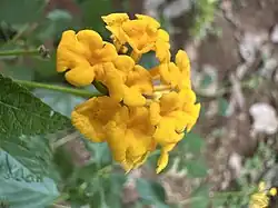 Lantana (/lænˈtɑːnə, -ˈteɪ-/)[2] is a genus of about 150 species of perennial flowering plants in the verbena family, Verbenaceae. They are native to tropical regions of the Americas and Africa but exist as an introduced species in numerous areas, especially in the Australian-Pacific region, South and Northeastern part of India. The genus includes both herbaceous plants and shrubs growing to 0.5–2 m (1.6–6.6 ft) tall. Their common names are shrub verbenas or lantanas. The generic name originated in Late Latin, where it refers to the unrelated Viburnum lantana.[3]