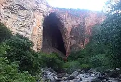 Lapa dos Brejões is one of the most remarkable group of caves in Brazil by the large amplitude of its galleries, halls, skylights, speleothems and its main entrance portico with 106 meters (348 ft) in height. A collapsed portion called karst canyon divides the cave into two segments, Brejões I and Brejões II, which together sum 7,750 meters (25,430 ft). Along the canyon one find shelter under the rocks and cave paintings of some sites.[1]