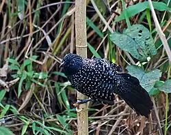 The large-tailed antshrike is a large dark antbird with a long full tail. It is 25 to 26 cm (9.8 to 10 in) long and weighs 58 to 62 g (2.0 to 2.2 oz). The species exhibits significant sexual dimorphism, though both sexes have a moderately long black bill with a hook at the end like true shrikes. Adult males are mostly black with small white spots on their crown, nape, upperparts, and sides. Adult females are mostly brownish black. Their forehead is rufous, their crown is rufous with black edges on its feathers, their upperparts have pale buff spots, and their wings have pale buff bars. Their underparts are thickly spotted with buffy white and their crissum is barred with buffy white. Subadults resemble adult females but their spots are larger and their belly and tail have faint pale bars.[4][5][6]