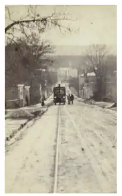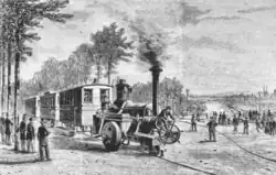 Consequent on the success of the Paris trial, in August 1868 Larmanjat opened a 5-kilometre (3-mile) line along the existing public road between Raincy and Montfermeil, east of Paris, to demonstrate how a cheaply laid track would be sufficient where only light traffic was expected. The locomotive was again supported on a single rail, with the driving wheels and the side wheels of the carriages running on the ordinary surface of the road. On the opening day the journey from Raincy to Montfermeil (the uphill direction with a maximum gradient of 1 in 14, 7%) took 20 minutes and the return journey, with firm application of the brakes, 17. A turning curve with a radius of 5 metres (16 ft) was provided at the west end of the line, with points and a turning triangle at the east.[2][5] The line was destroyed in 1870 after Raincy was the location of a heavy artillery engagement during the Franco-Prussian War.[6]