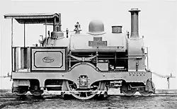 Sharp Stewart delivered the first locomotive to Buckhurst Hill, Essex, in December 1872, where a length of demonstration track had been laid. Public trials were held (with rolling stock supplied by Brown and Marshalls of Birmingham[11]) over two days in January 1873. Performance was satisfactory on the first day, when the weather was dry, but on the second day rain made the wooden planks slippery and the driving wheels were unable to maintain sufficient traction.[12] Nonetheless, Clark, Punchard were authorised to continue construction in Lisbon.[9]