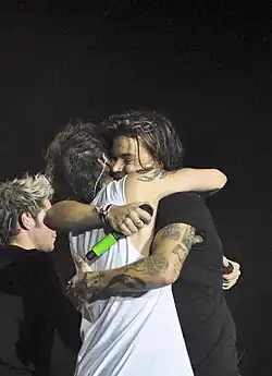 Former One Direction bandmate Zayn Malik addressed the conspiracy in 2015, saying that there were no secret relationships within the band and the belief had taken a toll on Styles and Tomlinson, who refrained from physically intimate behaviour like hugging as a result.[37][38] Band member Liam Payne said in 2015 that symbols at One Direction concerts like rainbow flags to indicate support of the conspiracy "drives [him] insane".[39]