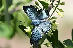 The top of the wings is metallic blue while the undersides are checker spotted and grayish brown. The wingspan is 2.2 to 3.2 cm (0.87 to 1.26 in). Caterpillars feed on Albizia species.[3]