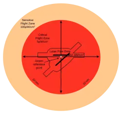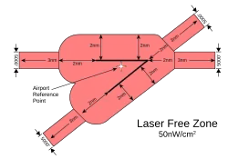 - The Laser Free Zone extends immediately around and above runways, as depicted at right. Light irradiance within the zone must be less than 50 nanowatts per square centimeter (0.05 microwatts per square centimeter). This was set at "a level that would not cause any visual disruption."[19]