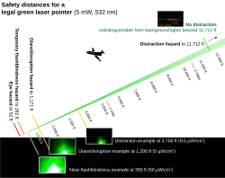 The graphic (right) illustrates laser safety concepts.[12] For example, it shows that the areas of most concern—eye damage, flash blindness and glare—occur relatively close to the aircraft. The distraction risk covers the longest hazard distance, but also presents the least concern. The photos in the graphic also give an idea of what the visual effect looks like to the pilot, at various distances. While the distances given are exact, the laser's brightness is in fact falling off slowly and so effects diminish continuously with increasing distance.