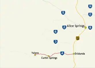 | Yulara | 0 | 0.0 | Route 4 continues to Kata Tjuta then to the Western Australian border becoming the Great Central Road | ||