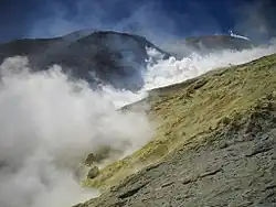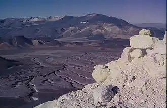 Lastarria displays vigorous fumarolic activity[1] on the summit and down the northwestern slopes.[23] Such activity has been observed since the European discovery of Lastarria, in the late 19th century.[5] Lastarria is the only volcano in the area with ongoing fumarolic activity.[53] It manifests in fumaroles forming 15-centimetre (5.9 in) high chimneys, small cones reaching heights of 2 metres (6 ft 7 in), 2.5 metres (8 ft 2 in) wide craters, 100 by 50 centimetres (39 by 20 in) fractures, in a diffuse fashion through pyroclastic deposits, as well as degassing through cracks and fissures on surfaces. Individual fumaroles have been found in the craters, on the crater edges, and on the slopes. A northwest–southeast striking fracture is associated with some of the fumaroles.[79][23][20] Four different fumarole fields have been found, one along this fissure on the northwestern slope at altitudes of about 4,950 to 5,140 metres (16,240 to 16,860 ft), two on the rims of the fourth crater, and one in the fifth crater.[70][66] The fissure field is the largest, covering a surface area of 0.023 square kilometres (0.0089 sq mi),[80] while the other fields can be as small as 0.001 square kilometres (0.00039 sq mi).[74] The alignment of fumarolic vents suggest that their position is controlled by the structure of the volcano.[16] The fumarolic activity has led to the deposition of borates, sulfates, sulfides and sulfur on Lastarria. Fumarole fields have colours trending from grey to red to yellow-orange to pale yellow with decreasing temperatures,[81] owing to different elements having different volatilities and depositing at different temperatures.[82]