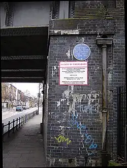 Where the road passes under the Great Eastern Main Line, there is a plaque indicating the spot where, on 13 June 1944, during the Second World War, the first V-1 flying bomb to hit London fell, killing six, injuring 30, and making 200 people homeless.[1] The area remained derelict for many years until it was cleared to extend Mile End Park. Before demolition, local artist Rachel Whiteread made a cast of the inside of 193 Grove Road. Despite attracting controversy, the exhibit won her the Turner Prize for 1993.[2]