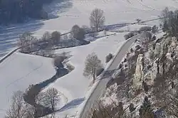 The Lauter (German pronunciation: [ˈlaʊtɐ] ⓘ), also known as Große Lauter (lit. 'Big Lauter'), is a small river of the Swabian Alb, Baden-Württemberg, Germany. Its karst spring is inside the walls of the former nunnery at "Offenhausen", a small settlement near Gomadingen. The river discharges into the Danube after 42 km. The river has a long geological history since late Miocene. Although the Swabian Alb is heavily karstified, this river's water runs aboveground all the way.