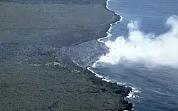 When a sub-aerial lava flow reaches the ocean (or other large body of water), contact with the water causes both rapid cooling of the lava and steam explosions that fragment it. The glassy fragments that are formed, known as hyaloclastites, fall down to the seabed forming foresets. As the seabed topography becomes infilled, the subaerial flow is able to build out. The process continues as long as the lava supply is maintained, creating a lava bench. A lava bench is a volcanic landform with a horizontal surface raised above the level of the surrounding area.[5] The Hawaiian islands are an example of land that was formed this way, and the Big Island is currently still expanding due to lava benches.[6] The Kilauea Volcano releases lava that flows down the slope of the volcano and eventually encounters the ocean; this lava flow hardens when it comes into contact with the significantly cooler water of the ocean and forms an unstable lava bench. Eventually, when the material beneath the lava bench stabilizes, it becomes stable land that has been added to the island.