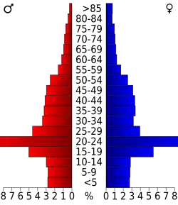 In the county, the population was spread out, with 20.4% under the age of 18, 26.4% from 18 to 24, 28.3% from 25 to 44, 16.9% from 45 to 64, and 7.9% who were 65 years of age or older. The median age was 27 years. For every 100 females there were 98.70 males. For every 100 females age 18 and over, there were 97.70 males.