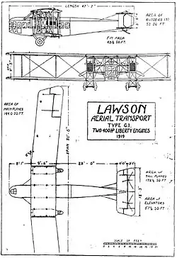 The Lawson Air Line Company designed and built a series of large biplane airliners for use on its planned airline routes. The initial Lawson "Aerial Transport" Lawson C1 or T-1 was built early in 1919 to demonstrate that a large commercial passenger plane could be built. The L-1 was a single pilot, 10 passenger biplane with twin Liberty 400 hp pusher engines. It was followed by the Lawson C.2 or L-2. The L-2 was a tractor biplane also with 400 hp engines, capable of carrying 26 passengers, and piloted by two pilots, with differential controls.[3]