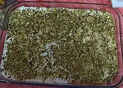 The dish consists of a layer of semolina pudding, usually prepared by boiling milk, semolina, and rose water together in a pan, sometimes gum arabic is added,[6] the mixture is poured into a tray and left to cool, a second layer of qishta is then prepared and added on top of the first layer after it had cooled.[8][4][5]