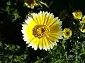 The flower heads are composed of five to eighteen yellow ray flowers with white tips and many central yellow disk flowers. Its outer ray flowers are bright golden yellow with distinct, sharp-margined white tips. The bracts tips are rounded and involucre 6–12 mm high. The corolla is 4–6 mm long. The ray flowers are 3–3.8 mm long and the disk flowers are 2.8–5 mm long. The ligules are 6–15 mm long and 5–10 mm wide. The florets are bisexual, pistillate, functionally staminate or neuter. The sepals are highly modified.[3]