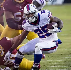 On March 10, 2015, the Eagles traded McCoy to the Buffalo Bills in exchange for the linebacker Kiko Alonso.[8] He then signed a new five-year contract worth $40 million.[9] McCoy's offseason was filled with many comments on his former coach, such as how Eagles coach and general manager Chip Kelly "got rid of all the good black players"[126] or that he "doesn't like or respect stars".[127] McCoy got a majority of the work in the backfield, sharing time with Karlos Williams, Anthony Dixon, and Mike Gillislee.[128] McCoy's season started slow, although this could be attributed to a nagging hamstring injury. Although McCoy rushed for 89 yards on 15 carries against the New England Patriots in Week 2, he had a yards per carry average less than 2.5 in games against the Indianapolis Colts and Miami Dolphins .[129][130][131] After missing two games with a hamstring injury, McCoy returned to his elite form, rushing for 90 yards on 17 carries against the Cincinnati Bengals in Week 6, gaining his first rushing touchdown of the season.[132] This game started a streak where McCoy gained over 100 yards from scrimmage for seven consecutive weeks, which was ended with a season ending MCL sprain against the Washington Redskins, his longtime divisional rival while he was with the Eagles.[133] In December, as the Bills prepared to face the Eagles in Philadelphia, McCoy said he would not shake Chip Kelly's hand, his former coach and the man who traded him.[134] Although he kissed the Eagles logo on Lincoln Financial Field and hugged owner Jeffrey Lurie, he did not participate in postgame ceremonies when the Bills lost.[135] He finished the 2015 season with 203 carries for 895 rushing yards and three rushing touchdowns to go along with 32 receptions for 292 receiving yards and two receiving touchdowns in 12 games.[136] He was ranked 69th on the NFL Top 100 Players of 2016.[137]