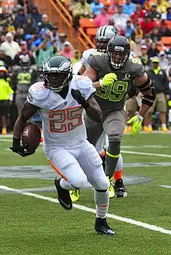 LeSean Kamel McCoy (born July 12, 1988), nicknamed "Shady", is an American former professional football player who was a running back in the National Football League (NFL). He played college football for the Pittsburgh Panthers and was selected by the Philadelphia Eagles in the second round of the 2009 NFL draft. McCoy attended Bishop McDevitt High School from 2002 to 2006.[1] In his senior year of high school, McCoy suffered a major ankle injury, which threatened his career. In his first year at Pittsburgh in 2007, he rushed for over 1,300 yards and recorded 14 touchdowns.[2] In 2008, McCoy was selected as a second-team All-American.[3] His 21 rushing touchdowns were third in the nation, only one behind the two leaders.