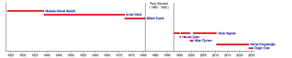 The Leader of the Republican People's Party (Turkish: Cumhuriyet Halk Partisi Genel Başkanı) is the leader of the Republican People's Party (CHP), the main opposition party in Turkey. Özgür Özel has been the leader since 8 November 2023, succeeding Kemal Kılıçdaroğlu.[1]