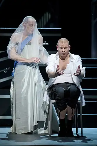 The production was revived in Munich in 1980.[2] The US premiere, in English translation, was presented by the San Francisco Opera in June 1981, with Thomas Stewart as Lear, under Gerd Albrecht.[3][4][5] The Paris premiere took place in November 1982, in a French translation by Antoinette Becker.[6] The UK premiere was presented by English National Opera in 1989;[1][7][8] the Swedish premiere took place at the Malmö Opera on 27 April 2013 with Fredrik Zetterström as Lear.
