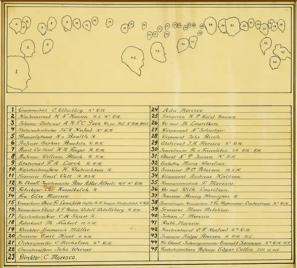 On 16 April 1856, Jacob Heinrich Moresco opened a store with women's clothing and fashion accessories at Amagertorv 13. His firm would later develop into the first large-scale industrial manufacturer of women's clothing in Denmark. Moresco is one of the businessmen depicted on Peder Severin Krøyer's monumental 1895 group portrait painting From Copenhagen Stock Exchange in Børsen.[1]