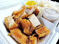 ![]() Lechon kawali with rice, dipping sauce and atchara pickles | |