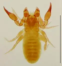 - ^ Benavides, Ligia R.; Cosgrove, Julia G.; Harvey, Mark S.; Giribet, Gonzalo (October 2019). "Phylogenomic interrogation resolves the backbone of the Pseudoscorpiones tree of life". Molecular Phylogenetics and Evolution. 139: 106509. Bibcode:2019MolPE.13906509B. doi:10.1016/j.ympev.2019.05.023. PMID 31132522. S2CID 167218890.