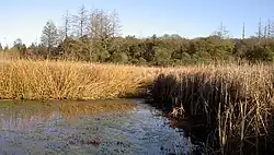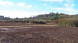 The marsh was formed by an earthen embankment dam about 300 feet (91 m) long, constructed in 1930 by a former landowner. The dam is about 6 feet (2 m) high and 4 feet (1.2 m) wide at its crest. Over the years, the dam deteriorated, allowing water to seep through it and causing the marsh to dry out in the autumn and refill during the winter rains. The deterioration was partly due to rodent holes and partly due to stumps left by the felling of eucalyptus trees that were planted on both sides of the embankment.[1]