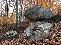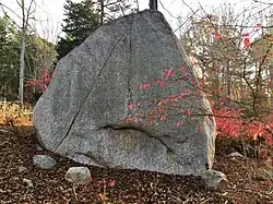 Ledyard is among the areas of the United States that was covered by a continental ice sheet during the last ice age. Therefore, Ledyard has its share of interesting glacial geology. The glaciers that covered Ledyard carried the many large boulders that are scattered around the town. The town has set aside land designated as a "Glacial Park", which consists of a section of end moraine and outwash deposits (containing kettles). This area encompasses a segment of the "Ledyard Moraine"—a clast-supported boulder deposit that is anomalous in nature. Examples of glacial erratics in Ledyard:
